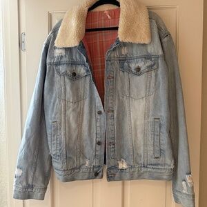 NWOT Free People Denim Car Coat Contrast Stitch Big Buttons Slouchy Large Blue