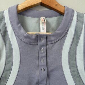 This NWOT Free People FP Movement Free Kick Muscle Tank Crop Top in size M/L features a Henley neckline and snap closure. Made from a knit fabric blend of polyester, polyamide, and elastane, it is perfect for travel, activewear, or casual wear. The sleeveless top in purple and gray colorblock design has wide straps, ribbed detailing, and an elastic waist for a slimming fit. Ideal for various activities like running, yoga, or weightlifting, this lightweight and breathable tank is versatile for all seasons.