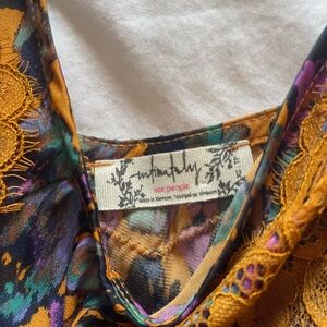 This Free People camisole top showcases a stunning gold hue with an asymmetrical design and delicate spaghetti straps. Crafted from a lightweight fabric, it offers a flowing silhouette perfect for a bohemian-inspired look. The intricate detailing and vibrant color make it a standout piece for any occasion.
