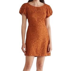 Take your dress collection to the next level with this cool and classic mini featured in a staple, A-line fit and lace-adorned fabrication with puffed sleeves, empire waist, and tie closure at back for added dimension.