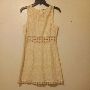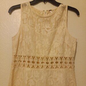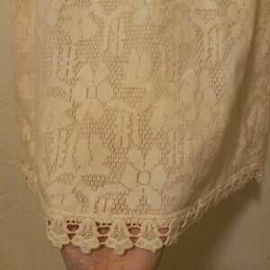 Ivory/cream lace and crochet dress. Floral lace overlay accented by crochet trim and unlined crochet band just above waist for a peek-a-boo cut out effect . Unlined at yoke creating a sweetheart bustier and skirt 2-piece effect with the added comfort of tummy coverage and not having to adjust the pieces. Zipper back. Pair with boots (cowgirl or doc martens) for a current look, with heels for a holiday party, with converse/keds and a denim or leather jacket to dress it down.