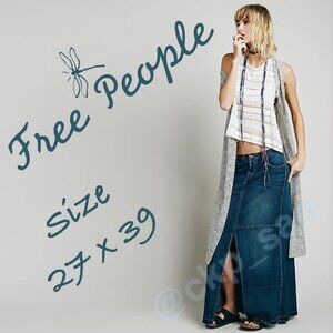 NWOT Free People Leann Patchwork Maxi Skirt in size 27. Patchwork denim maxi skirt with frayed hem and four-pocket design. Features a daring front slit, back cinch, and a button fly. Wiskering and distressing/fading throughout and a raw hem. This skirt is very long but so adorable. I wish it would fit me. Excellent new without tag condition. Please see pictures for details, fabric content, condition & measurements, since they are part of the description. Sold out in stores for years. Reasonable offers welcome.