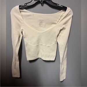 BRAND NEW WITHOUT TAGS✨ Plastic tag barbs still attached. Color: Ivory Forever-flattering cami featured in a stretchy ribbed knit fabrication with an underbust seam and wide scoop-neckline. Fit: Formfitting, cropped-length, fitted sleeves Features: Stretchy ribbed knit, underbust seaming, wide neckline Why We ❤️ It: This classic long-sleeve can be worn on its own or layered up with your favorite wardrobe staples.
