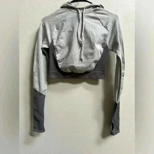 Features: Soft heather fabrication, cropped hoodie with long-sleeves and an adjustable drawstring, thumbholes at sleeves.