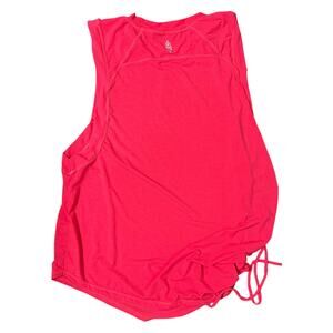 The Free Movement Tempo Tunic is a relaxed fit muscle tee with a crew neck. The tunic features soft, quick-drying fabrication and an asymmetrical hem with a ruched side tie detail.