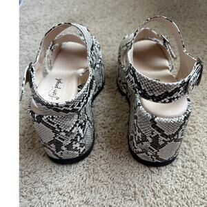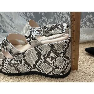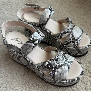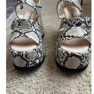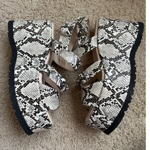 Keywords: Free People, snakeskin, platform sandals, wedge sandals, buckle straps, statement shoes, bold print, chunky heels, summer fashion, festival style, edgy footwear, walking sandals, fashionable, unique design, festival, trendy, boho