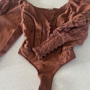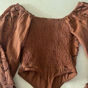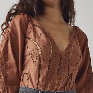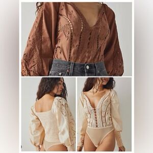 NWOT Free People Regina Bodysuit Top Thong Eyelet Balloon Sleeves Smocked Retro