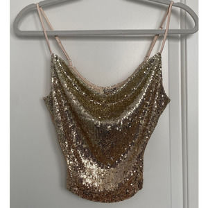 NWOT Free People Stop and Stare Gold Sequin Cami Top with satin adjustable straps