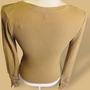 NWOT Free People ‘Wear Me Out’ Thermal Mesh Lace Cuff Sleeve Top in “Olive Leaf”