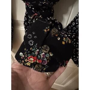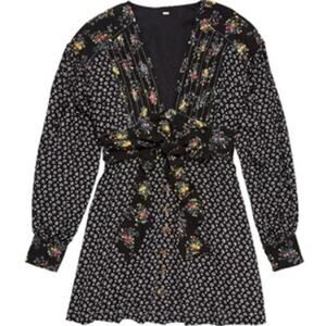 Black crepe mini dress. Contrast floral-print panels, pintucked bodice, dropped shoulders, button-fastening cuffs, belt loops, detachable waist tie, partially lined. Button fastenings through front 100% rayon. Color: black Size: M