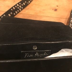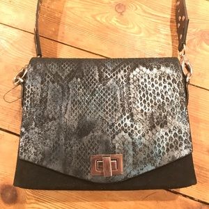 Brand new without tags! Ultra cool suede crossbody with a chic, edgy feel. Features a metallic snakeskin design on the body with a simple twist lock closure. Removable strap has studded accents and grommet details allover.