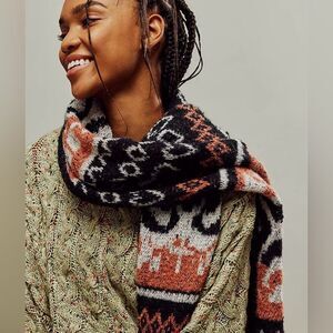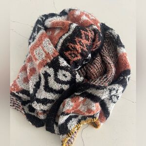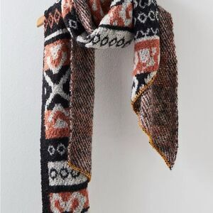 Stylish knit scarf with a multicolor pattern. Features black, white, and pink hues. Perfect for adding warmth and style.