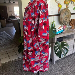 NWOT Free Planet button down shirt, size Large. Red, white and blue with American flags and fireworks on it. 100% Rayon