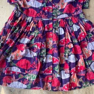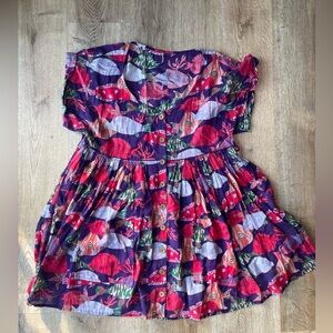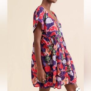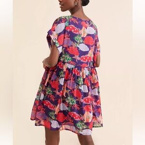 Bring playful coastal vibes to your wardrobe with this Free People Oceana Print Mini Dress. Featuring a colorful under-the-sea print with bright red crabs, coral, and fish against a purple background, this dress is perfect for summer days and beach getaways. Designed with a relaxed, oversized fit, short sleeves, and a flattering gathered waist, it’s as comfortable as it is eye-catching. Button front closure and convenient pockets add to the charm.