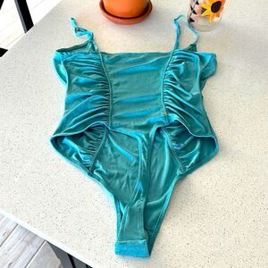 NWOT Free People Bodysuit Teal Loose Fit Ruched Tank S Stretchable Retro Thong