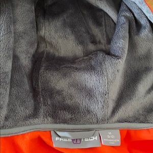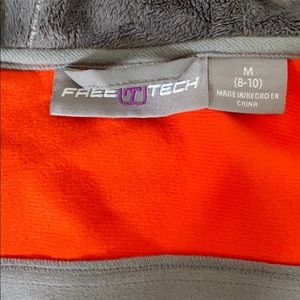 Size M (8-10). Color is a mix of red, orange and pink. Warm hood.