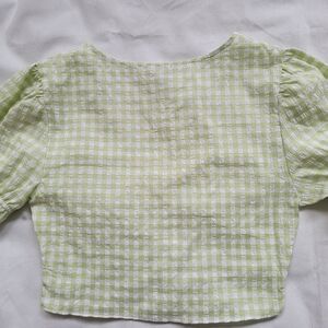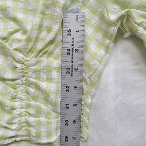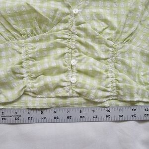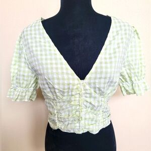New Without Tags Freshman women's large short sleeve top. Green and white gingham, deep v with front buttons. puff sleeves with cuff, front bottom gather.