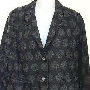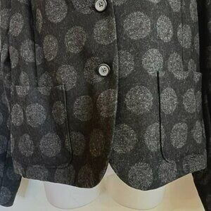 Cute and unique black wool blend blazer with big gray polka dots, "Gray Dots", featuring 2 button front, long sleeves, princess seaming, patch pockets, back vent still stitched closed, and unlined. Made of 51% Wool, 26% Polyester, 21% Viscose, 2% Other Fibers.