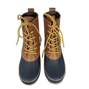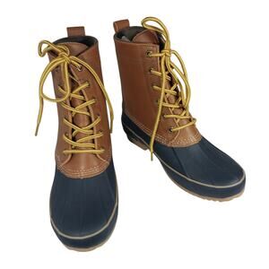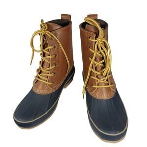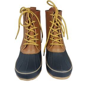 From G.H. Bass come these awesome waterproof classic duck boots in tan genuine leather and navy rubber! With a wrapped rubber sole, all double stitched, LACE-UP front, and traditional style! Perfect for winter weather! 3/4" heel, 6.25" shaft rise, Size 7, ***NEW Without Tags, and Guaranteed Superb by Lily @HauteClub!*