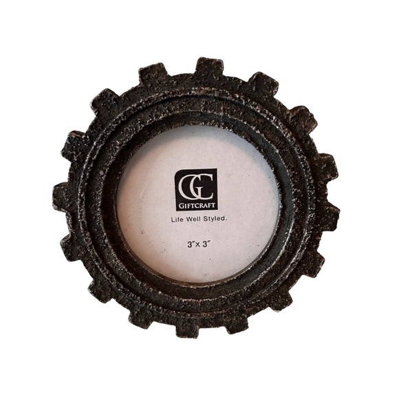 GIFTCRAFT 3" x 3" gear shaped frame with a distressed weathered industrial aesthetic. Easel back Acrylic insert NWOT with no damage