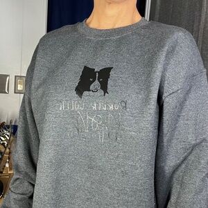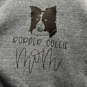 Brand new. Who loves their Border Collie?? Soft, gray, crewneck sweatshirt. Soft, gray, crewneck sweatshirt which displays a cute Border Collie face, and reads 'Border Collie Mom.' Size Large. Approx measurements in inches when laid flat: shoulders 23.5 across, chest 24 across pit to pit, full length 27. 12 oz.
