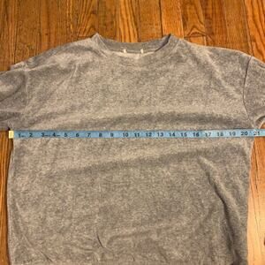 Super soft grey velour sweatshirt with ruched sleeves for a fashion-y touch. Tags were cut out but measurements are in photo. New, never worn