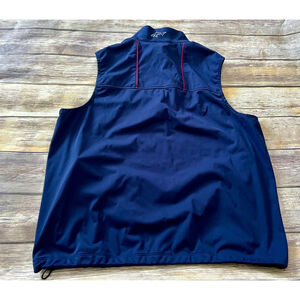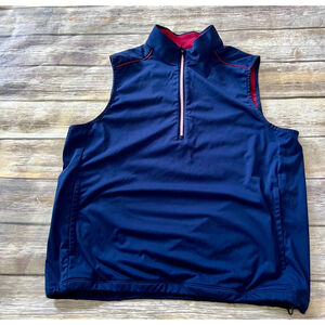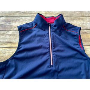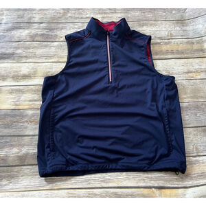 Greg Norman. Size medium. New without tags. Navy blue golf vest. Half zip. Burgundy Inner. Two front pockets. Approximately 27” length. 21” across. 100% polyester.