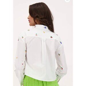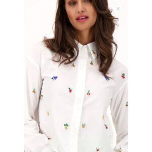 This white button-up shirt features delightful embroidered fruits, adding a touch of whimsy to a classic design. Ideal for casual or professional settings.