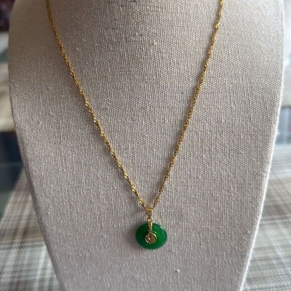 NWOT genuine imperial green jade donut disc pennant with happiness circle on 18K gold plated over stainless steel chain with ring clasp.