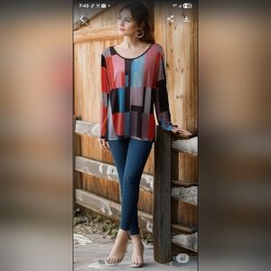 Look sharp in this brand new without tags (NWOT) size medium top, featuring a striking geometric color block pattern. The long-sleeve shirt showcases a vibrant and modern mix of reds, blues, grays, and black in a playful, abstract design. The lightweight, comfortable fabric and classic scoop neck make it a versatile piece you can easily dress up or down.