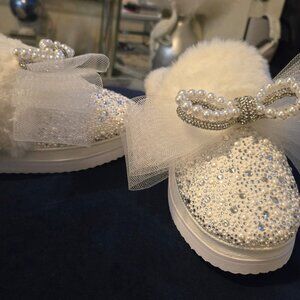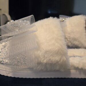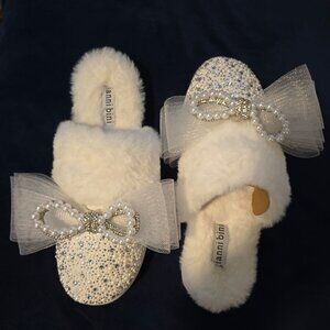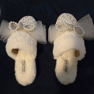 ✨NWOT Gianni Bini Rhinestone & Pearl Bow Faux Fur Slippers Sz 8 – Bridal Glam✨