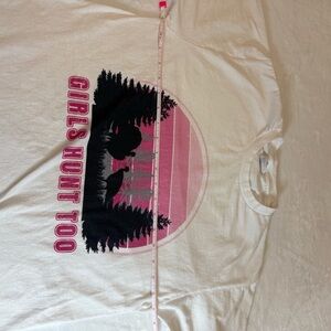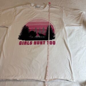 This stylish 'Girls Hunt Too' t-shirt features a vibrant pink design on a classic white background. Perfect for hunting enthusiasts! Make a statement with this shirt! NWOT and smoke free home. Please see pictures for measurements.