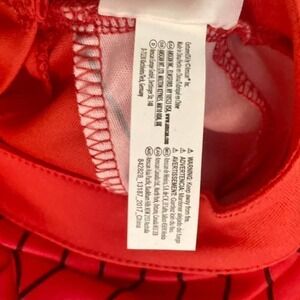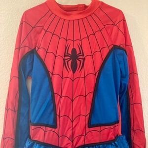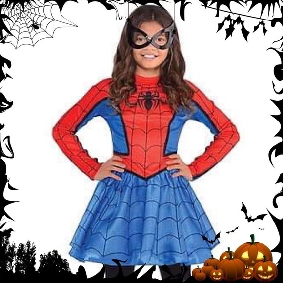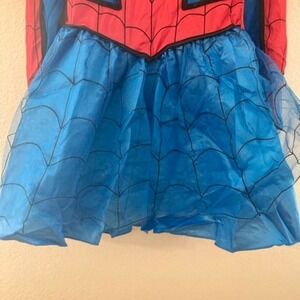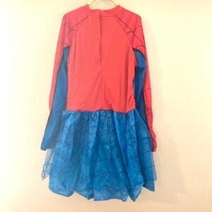 Size child’s large (12-14). Includes dress and eye mask. Dress is styled to look like a shirt and tutu. Top is red and blue with black spider and spiderweb detailing. Skirt is a layer of blue tulle over blue fabric. The tulle has black glittery spiderweb pattern throughout. Dress is secured via velcro at back of neck. Eye mask has a thin elastic strip to secure to head. Made of 100% polyester. Marvel Kids.