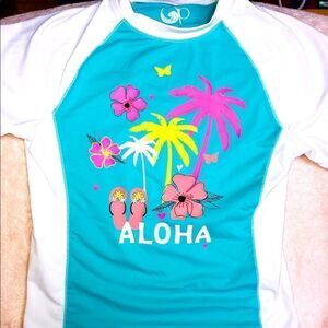 New Without Tags Girls Large (10/12) OP (Ocean Pacific) Short Sleeve Beach Swim Shirt. Aloha Print Graphic. teal/White. Smoke Free Home. #rashguard #oceanpacific