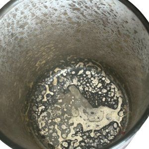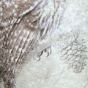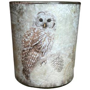 This candle holder features an owl perched on a pine tree branch with a faded crown to the left. The lovely snowy background is ethereal and wraps around the entire candle holder; the inside of the candle has a mercury glass finish. When a candle is placed inside and the flame flickers, it almost looks as though the background of this candle has come to life. It's mesmerizing.