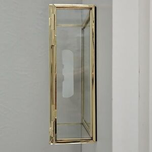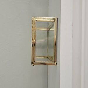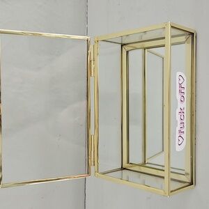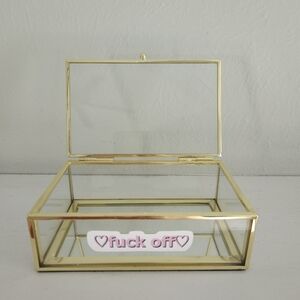 New without tags- Gold trimmed glass decorative jewelry box featuring hinged lid that stays open, mirrored inlay bottom, silicone outer bottom to keep in place on table and cute pink sticker I put on. Box measures 5.25 in width x 1.75 in height closed x 5 in height open x 3.5 in depth.