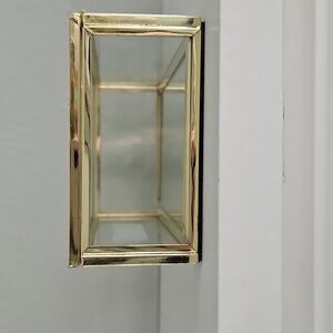 New without tags- Gold trimmed glass decorative jewelry box featuring hinged lid that stays open, mirrored inlay bottom, silicone outer bottom to keep in place on table and cute pink sticker I put on. Box measures 5.25 in width x 1.75 in height closed x 5 in height open x 3.5 in depth.