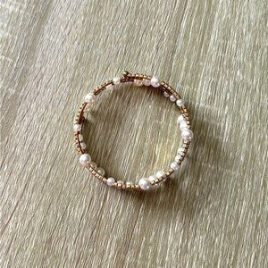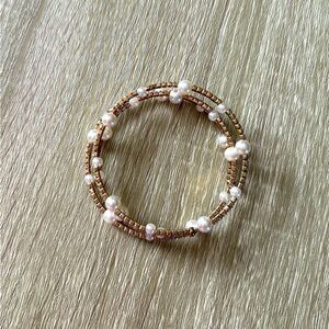 Classic pearls are delicately threaded along a coiled gold wire, creating a glamorously golden infinity wrap style around the wrist 💕😍💕
