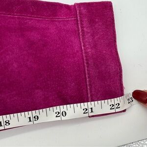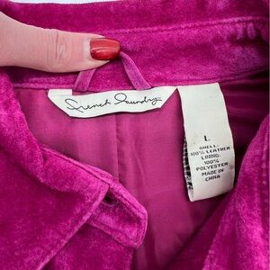 Make a statement with this stunning French Laundry fuchsia leather jacket in size large. Crafted from 100% leather, this piece boasts a luxurious suede-like texture and vibrant fuchsia hue that’s sure to turn heads. Perfect for adding a bold pop of color to your outfit, it’s both stylish and versatile.
