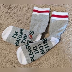 NWOT, brand new, never worn, soft and stylish women's Philadelphia Eagles football socks, gray body with a white toe and heel, red & white stripe on top. Perfect for Philly game day or everyday wear. Font on bottom of socks is Eagles green color. Bottom of one foot says "PLEASE DO NOT DISTURB". Bottom of the other foot says "I'M WATCHING THE EAGL🏈S".