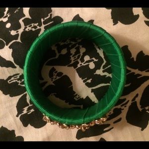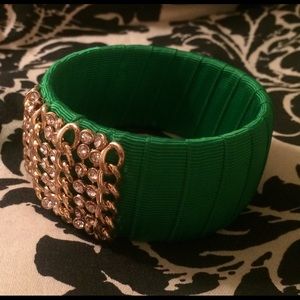 NWOT Green fabric bangle with gold & crystal chain detailing. Approximately 2.75" in width and 1.5" in height.