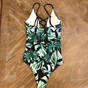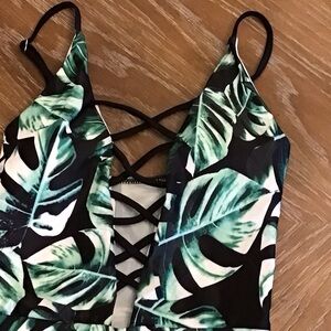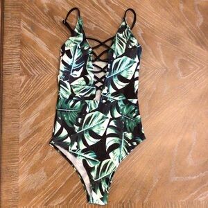 Green Leaf Print Womens Lace Up One Piece Swimsuit Size Small. Brand new without tags. Hygiene liner attached. Never worn, just tried on. From smoke free home. * stock photos print may vary slightly from actual item.