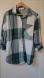 Green and white plaid buttondown shirt with front chest pockets. Side waist has 3 buttons on each side to give shirt a side slit for more room. Sleeves have button to secure if you roll up the sleeves
