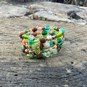 NWOT handmade memory wire bracelet in various shades of greens and earth colors - gold, browns, rust, and rose. Over four coils of beads including carnelian, yellow turquoise, wood, brass, vintage and modern glass, crystal and acrylic beads. The bracelet is accented with a lovely wire wrapped leaf charm.