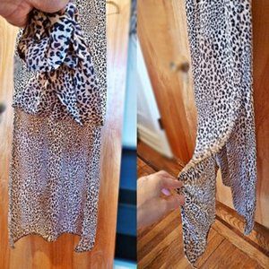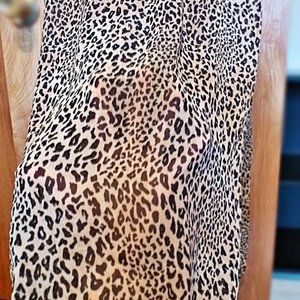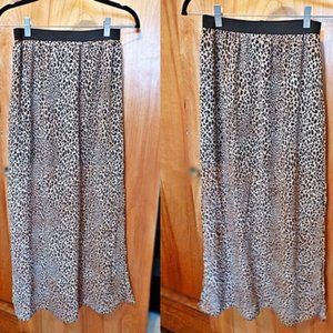Sexy and chic maxi skirt in leopard print by H&M. The skirt has 2 layers - the outer long sheer leopard print and an inner short black skirt within. With elasticized waistband, the skirt has a fluidity flow to it aided by the long side slits for easy movement that also give a peek to sexy legs.