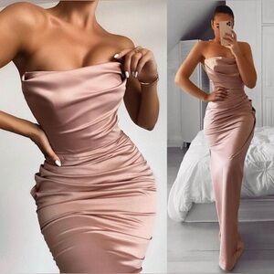 NWOT HOUSE OF CB ADRIENNE Blush Satin Strapless Gown/ Dress. Size S