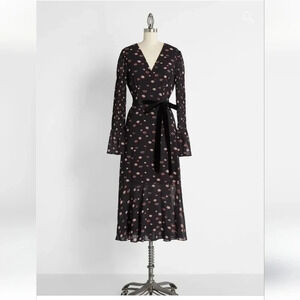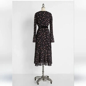 Details: Darling smocked sleeves with ruffles at wrist, V neck wrap dress with a clasp at neckline, made out of a chiffon to give dress a nice flow, adjustable black velvet tie at waist, and darts at bustline. Lined.