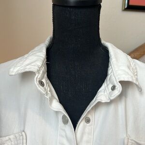 White denim shirt jacket. Has an oversized boxy fit. I am typically an XL and this fits comfortably.