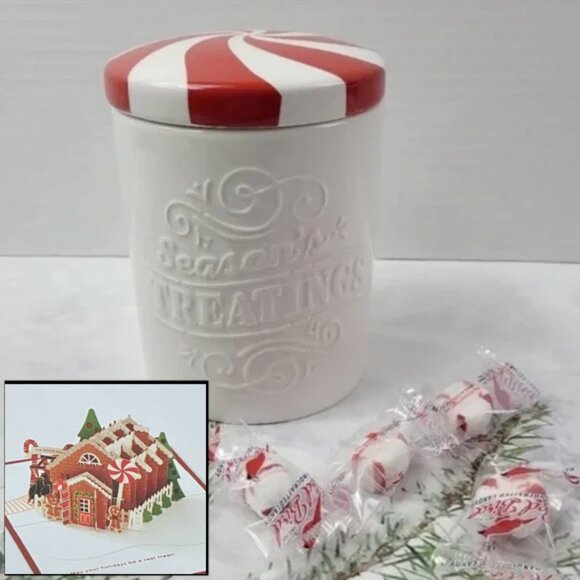NWOT Hallmark Season's Treatings Peppermint Lid Canister/Jar and 3D Card Set