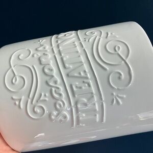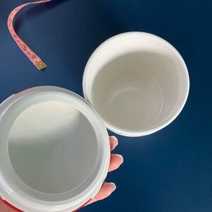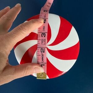 Cute porcelain canister done in white with a candy cane lid in vibrant red and white swirl.